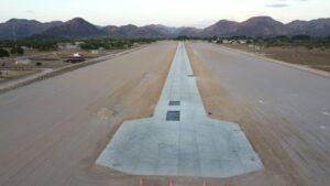 The new airstrip, designed to last up to 30 years, features a rigid concrete surface eight inches thick, stretching 3,000 feet long and 50 feet wide, with a strength of 5,000 pounds per square inch (PSI).